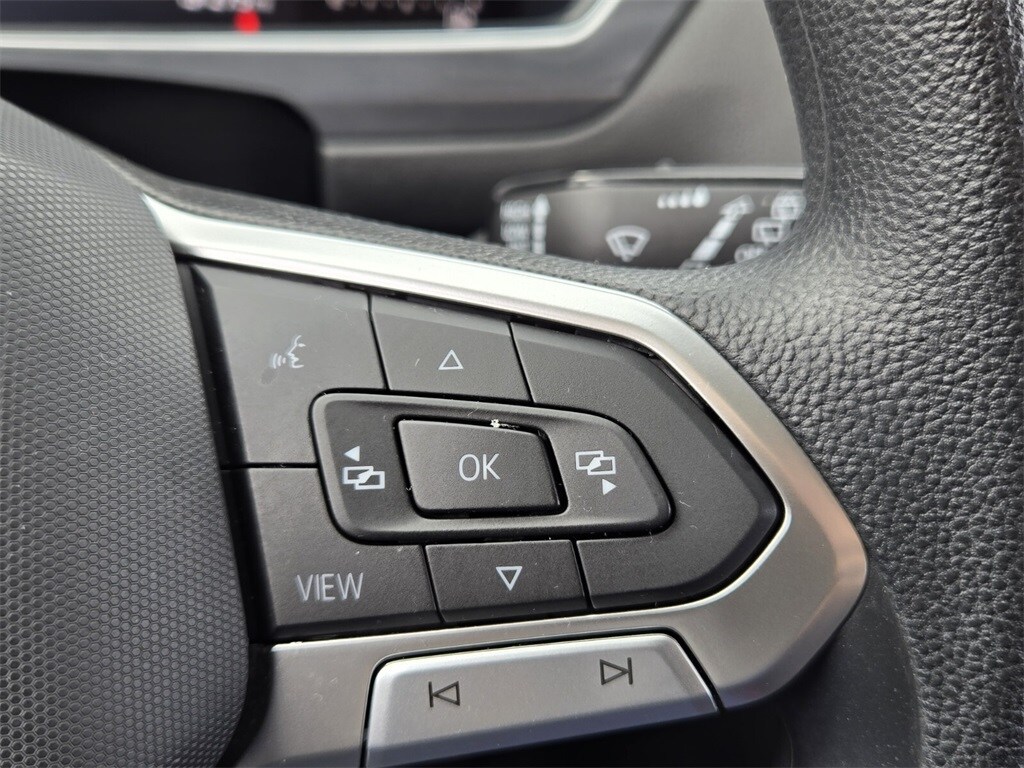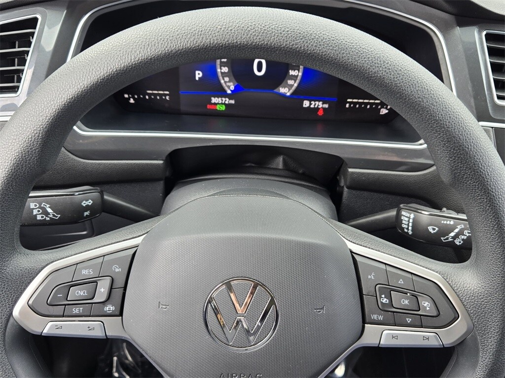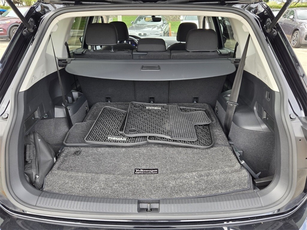 This vehicle comes equipped with 3-Row Rubber Monster Mats w/Logo Kit (Set of 5), 3.33 Axle Ratio, 3rd row seats: bench, 4-Wheel Disc Brakes, 4-Wheel Independent Suspension, 6 Speakers, ABS brakes, Air Conditioning, Alloy wheels, AM/FM radio, Brake assist, Bumpers: body-color, Cargo Area Retractable Privacy Cover, Cloth Seating Surfaces, Compass, Credit - Rear Sensors Removed, Delay-off headlights, Driver door bin, Driver vanity mirror, Dual front impact airbags, Dual front side impact airbags, Electronic Stability Control, Emergency communication system: VW Car-Net Safe & Secure 5-year, Exterior Parking Camera Rear, First Aid Kit, Forward collision: FCW w/Autonomous Emergency Braking mitigation, Four wheel independent suspension, Front anti-roll bar, Front Bucket Seats, Front Center Armrest, Front reading lights, Fully automatic headlights, Heated door mirrors, Heated Front Bucket Seats, Heated front seats, Heavy Duty Trunk Liner w/VW CarGo Blocks, Illuminated entry, Leather Shift Knob, Low tire pressure warning, Occupant sensing airbag, Outside temperature display, Overhead airbag, Overhead console, Panic alarm, Passenger door bin, Passenger vanity mirror, Power door mirrors, Power steering, Power windows, Radio data system, Radio: Composition Color AM/FM, Rear anti-roll bar, Rear reading lights, Rear seat center armrest, Rear window defroster, Rear window wiper, Remote keyless entry, Roadside Assistance Kit, Speed control, Speed-sensing steering, Split folding rear seat, Spoiler, Steering wheel mounted audio controls, Tachometer, Telescoping steering wheel, Tilt steering wheel, Traction control, Trip computer, Turn signal indicator mirrors, Variably intermittent wipers, and Wheels: 17" 2-Tone Machined Twin 5-Spoke Alloy .