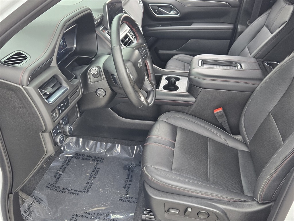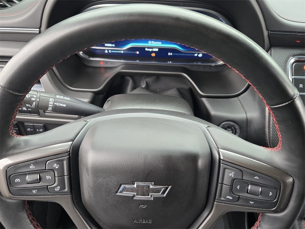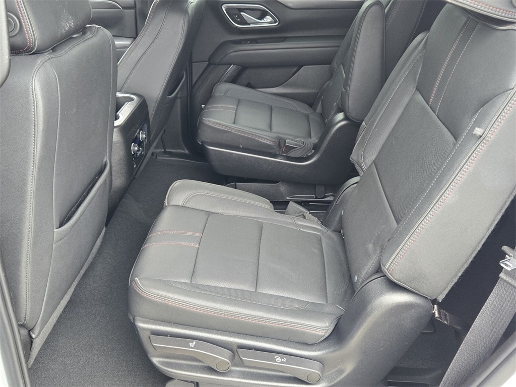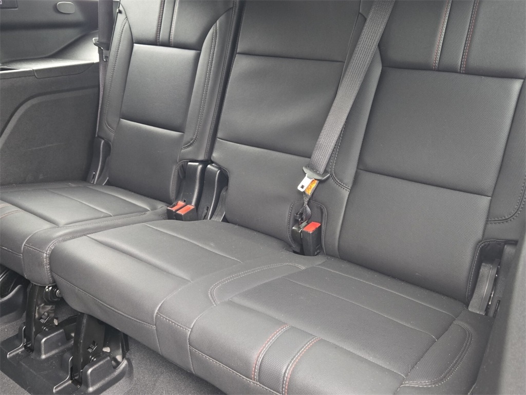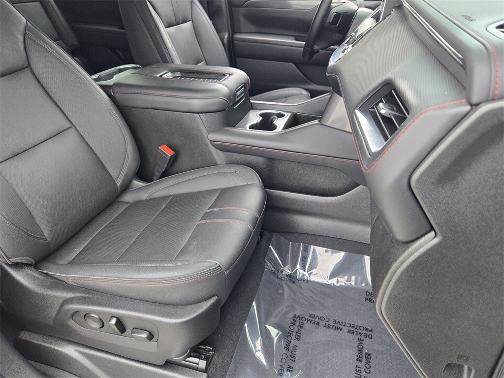 This vehicle comes equipped with Driver Alert Package (Lane Change Alert w/Side Blind Zone Alert and Rear Cross Traffic Alert), License Plate Front Mounting Package, Luxury Package (2nd Row Pwr Release 60/40 Split-Folding Bench Seat, 3rd Row 60/40 Power-Folding Split-Bench Seat, Adaptive Cruise Control, Enhanced Automatic Emergency Braking, HD Surround Vision, Heated 2nd Row Outboard Seats, Heated Steering Wheel, Memory Settings, Outside Heated Power-Adjustable Mirrors, Power Tilt & Telescopic Steering Column, and Rear Pedestrian Alert), Preferred Equipment Group 1SP (1st & 2nd Row Color-Keyed Carpeted Floor Mats, Auto-Dimming Inside Rear-View Mirror, Bose 9-Speaker Stereo Audio System Feature, Bright Front & Rear Door Sill Plates, Color-Keyed Carpeting Floor Covering, Driver & Front Outboard Passenger Airbags, Enhanced Driver Information Center, Floor Console w/Storage Area, Hands-Free Rear Power Programmable Liftgate, Infotainment Display, LED Daytime Running Lamps, Memory Settings for Driver, Remote Start, SiriusXM Radio w/360L, Universal Home Remote, Wireless Charging, and Wrapped Steering Wheel), 4WD, Jet Black/Victory Red Leather, 10-Way Power Driver & Passenger Seat Adjusters, 3.23 Rear Axle Ratio, 3rd row seats: split-bench, 4-Wheel Disc Brakes, 9 Speakers, ABS brakes, Air Conditioning, Alloy wheels, AM/FM radio: SiriusXM with 360L, Apple CarPlay/Android Auto, Auto High-beam Headlights, Auto-dimming Rear-View mirror, Automatic temperature control, Brake assist, Bumpers: body-color, Compass, Delay-off headlights, Driver door bin, Driver vanity mirror, Dual front impact airbags, Dual front side impact airbags, Dual-Pane Power Panoramic Sunroof, Electronic Stability Control, Emergency communication system: OnStar and Chevrolet connected services capable, Four wheel independent suspension, Front anti-roll bar, Front Bucket Seats, Front Center Armrest, Front dual zone A/C, Front High-Back Reclining Bucket Seats, Front reading lights, Fully automatic headlights, Garage door transmitter, Heated door mirrors, Heated Driver & Front Passenger Seats, Heated front seats, Illuminated entry, Low tire pressure warning, Memory seat, Navigation System, Not Equipped w/Wheel Locks (LPO), Occupant sensing airbag, Outside temperature display, Overhead airbag, Overhead console, Panic alarm, Passenger door bin, Passenger vanity mirror, Perforated Leather Seat Trim, Power door mirrors, Power driver seat, Power Liftgate, Power passenger seat, Power Release 2nd Row Bucket Seats, Po