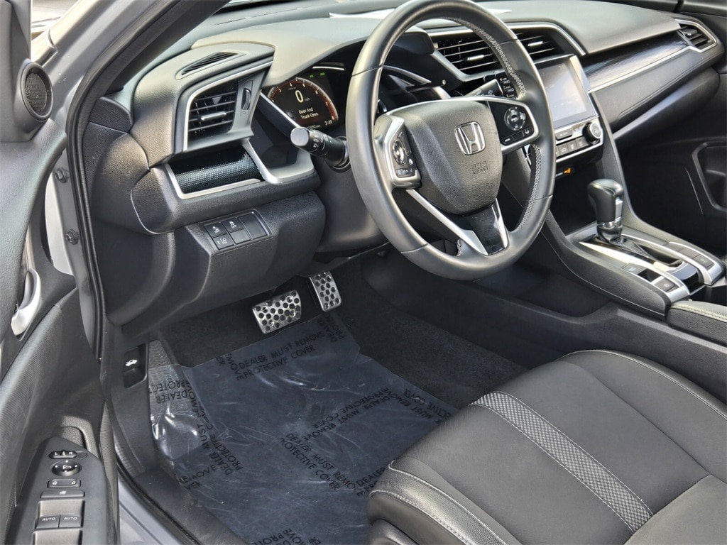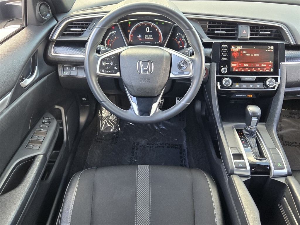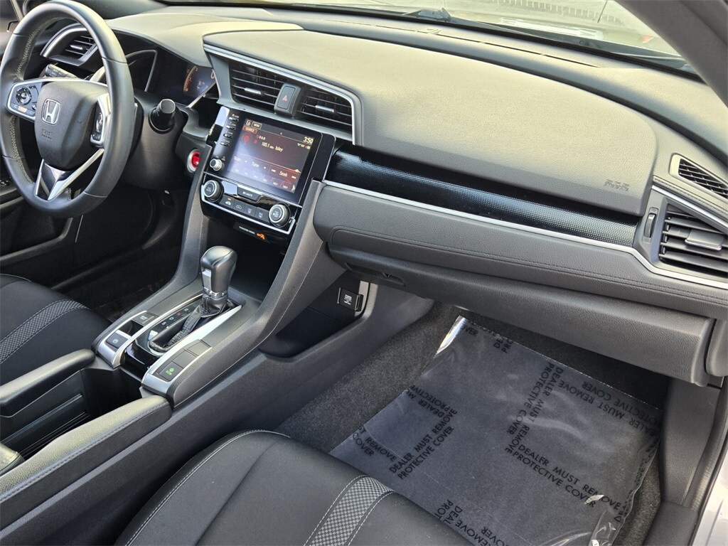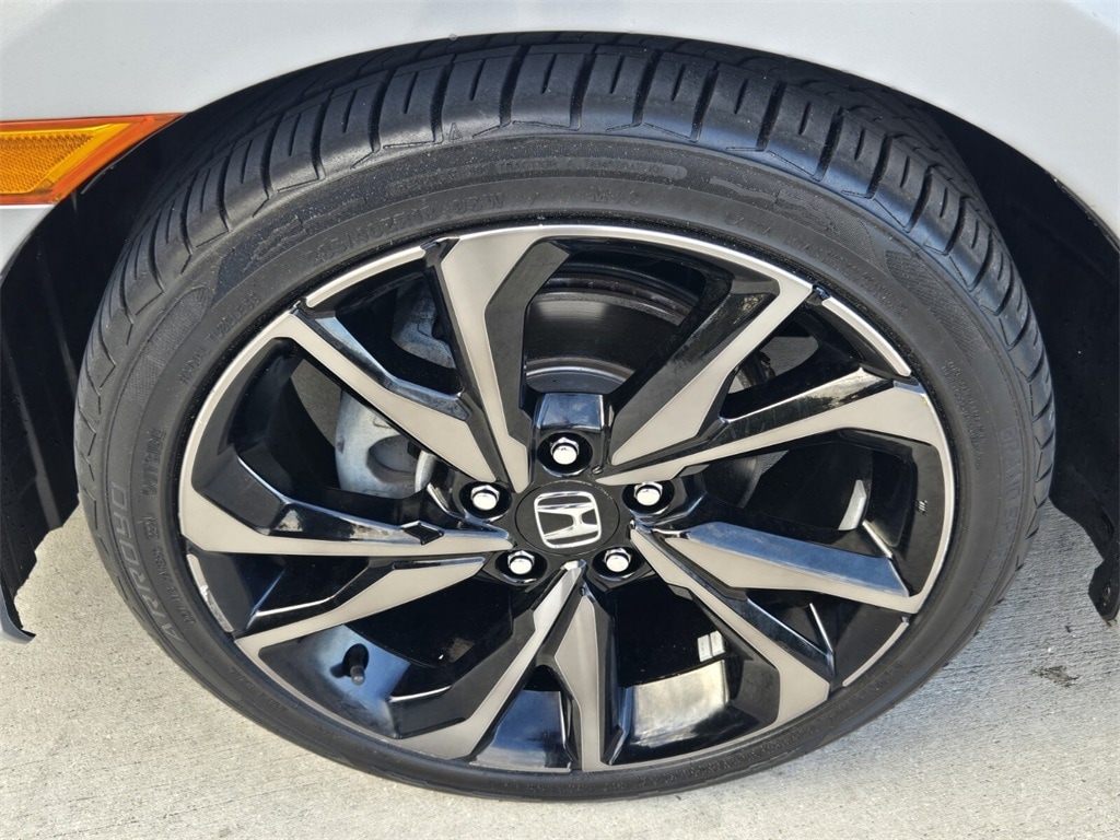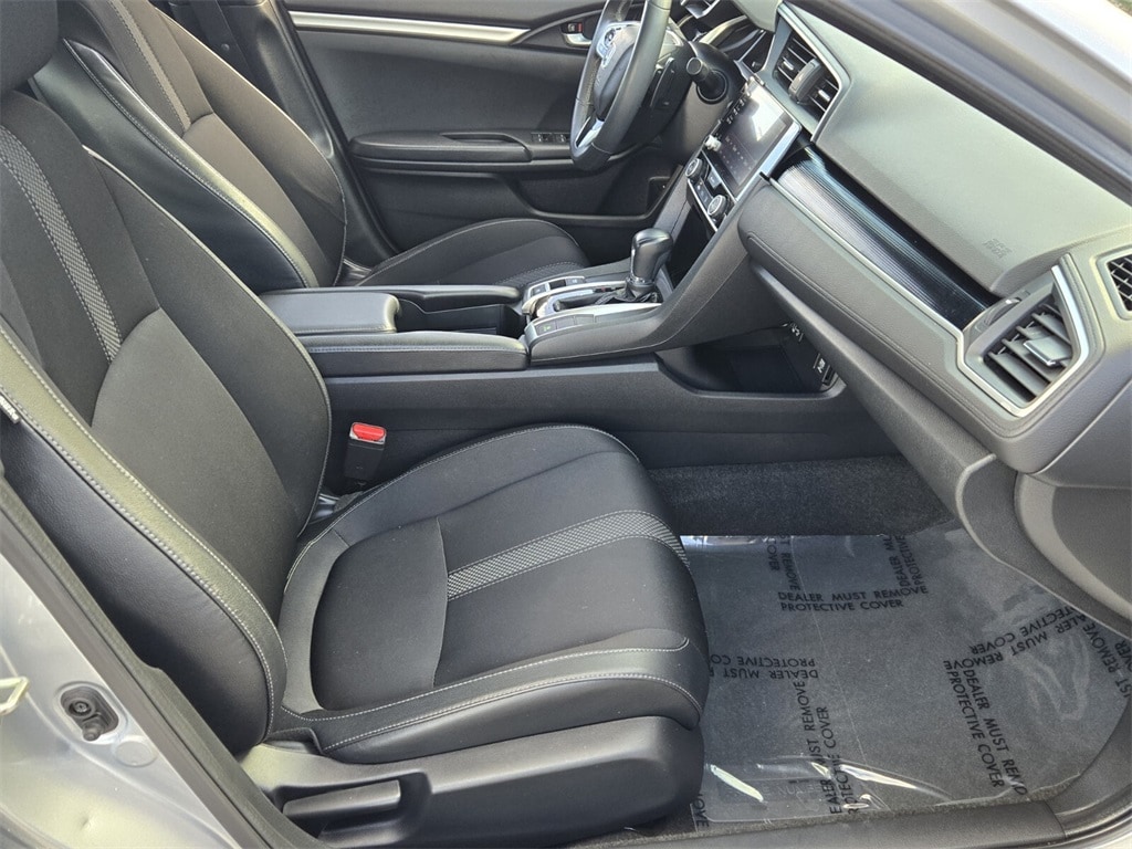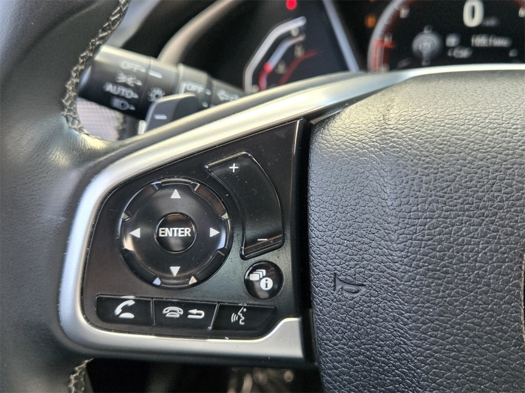 This vehicle comes equipped with Cloth, 4-Wheel Disc Brakes, 8 Speakers, ABS brakes, Adaptive Cruise Control: Adaptive Cruise Control (ACC) with Low-Speed Follow, Air Conditioning, Alloy wheels, AM/FM radio, Apple CarPlay/Android Auto, Auto High-beam Headlights, Automatic temperature control, Brake assist, Bumpers: body-color, Cloth Seat Trim, Delay-off headlights, Driver door bin, Driver vanity mirror, Dual front impact airbags, Dual front side impact airbags, Electronic Stability Control, Emergency communication system: HondaLink, Exterior Parking Camera Rear, Forward collision: Collision Mitigation Braking System (CMBS) + FCW mitigation, Four wheel independent suspension, Front anti-roll bar, Front Bucket Seats, Front Center Armrest, Front fog lights, Front reading lights, Fully automatic headlights, Illuminated entry, Lane departure: Lane Keeping Assist System (LKAS) active, Leather Shift Knob, Low tire pressure warning, Occupant sensing airbag, Outside temperature display, Overhead airbag, Panic alarm, Passenger door bin, Passenger vanity mirror, Power door mirrors, Power steering, Power windows, Radio data system, Radio: 180-Watt AM/FM Audio System, Rear anti-roll bar, Rear window defroster, Remote keyless entry, Security system, Speed control, Speed-sensing steering, Split folding rear seat, Spoiler, Steering wheel mounted audio controls, Tachometer, Telescoping steering wheel, Tilt steering wheel, Traction control, Trip computer, and Wheels: 18" Alloy w/Gloss Black Inserts .
