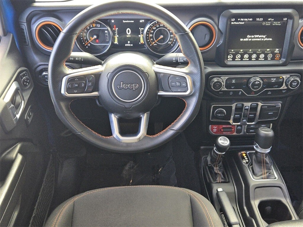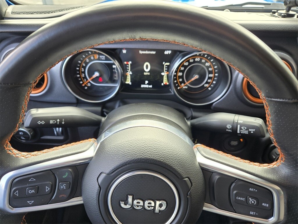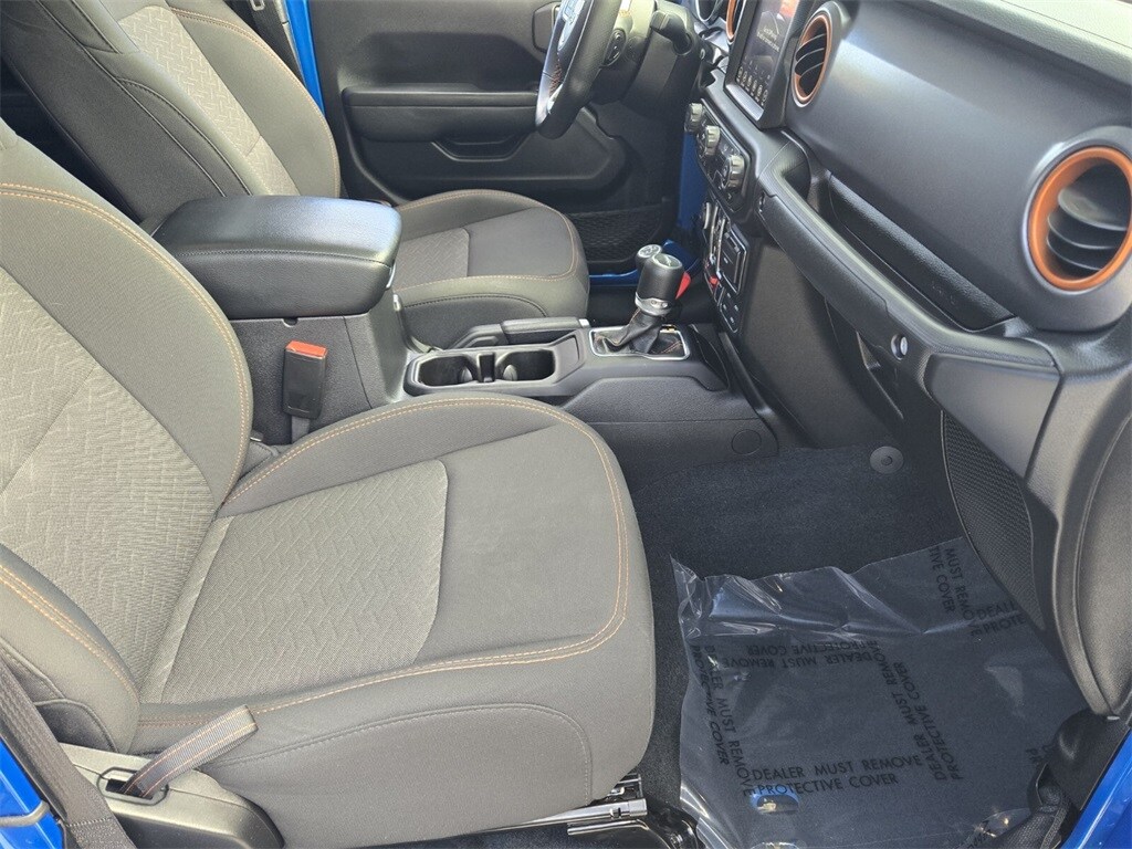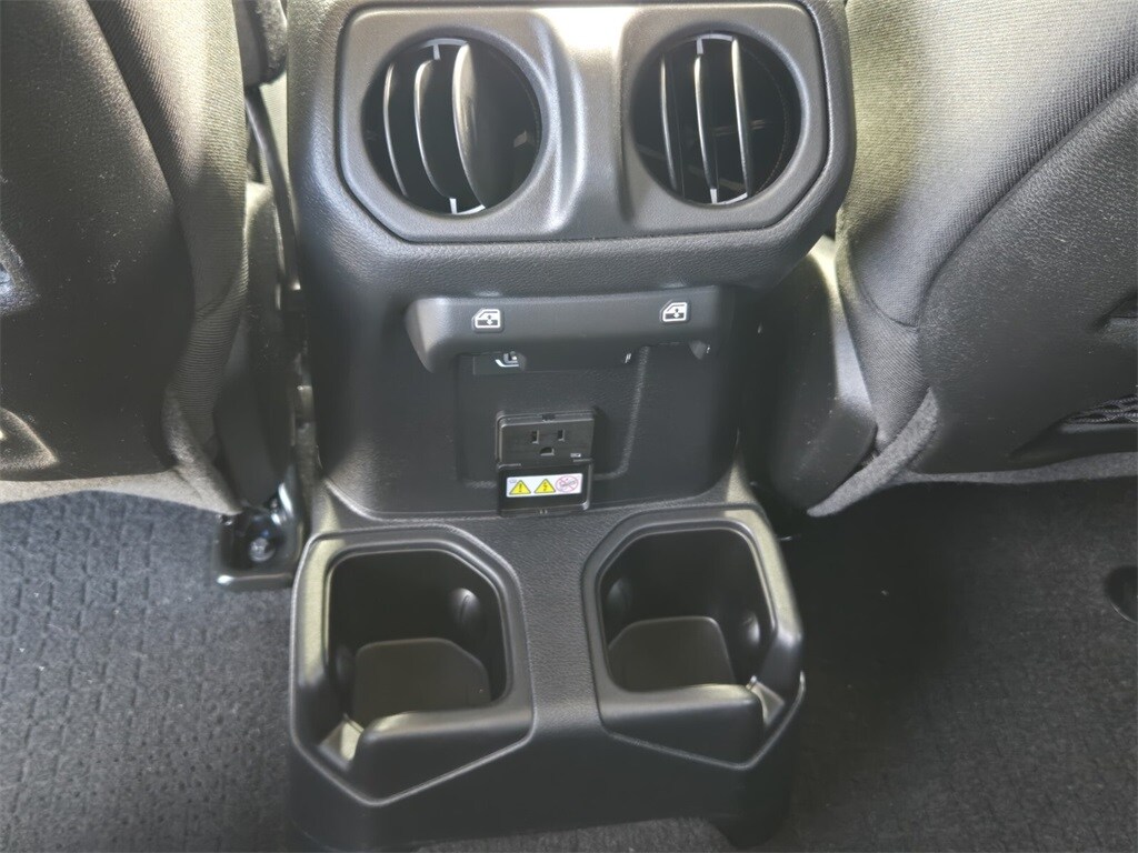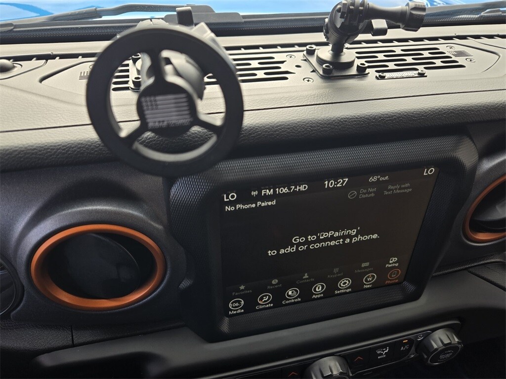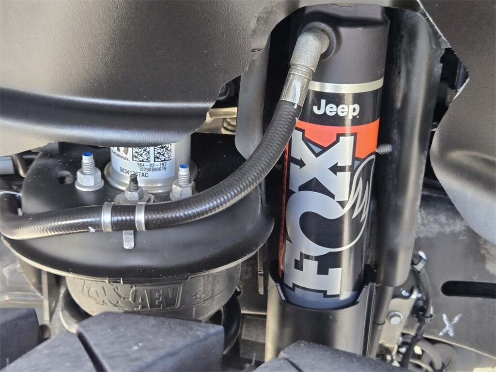 This vehicle comes equipped with Quick Order Package 24D Mojave, Trailer Tow Package (Class IV Receiver Hitch and Trailer Hitch Zoom), 4-Wheel Disc Brakes, 4.10 Rear Axle Ratio, 9 Speakers, 97 MPH Vehicle Max Speed Calibration, ABS brakes, Air Conditioning, Alloy wheels, AM/FM radio: SiriusXM, Apple CarPlay/Android Auto, Auto-dimming Rear-View mirror, Automatic temperature control, Black 3-Piece Hard Top, Brake assist, Compass, Delay-off headlights, Driver door bin, Driver vanity mirror, Dual front impact airbags, Dual front side impact airbags, Electronic Stability Control, Emergency communication system, Freedom Panel Storage Bag, Front anti-roll bar, Front Bucket Seats, Front Center Armrest w/Storage, Front dual zone A/C, Front fog lights, Front reading lights, Fully automatic headlights, Garage door transmitter, Heated door mirrors, Heavy Duty Suspension w/Gas Shocks, Illuminated entry, Integrated roll-over protection, Leather steering wheel, Low tire pressure warning, Navigation System, Occupant sensing airbag, Outside temperature display, Panic alarm, ParkView Rear Back-Up Camera, Passenger door bin, Passenger vanity mirror, Power door mirrors, Power steering, Power windows, Premium Cloth Seats w/Sport Bolsters, Radio data system, Radio: Uconnect 4C Nav w/8.4" Display, Rear anti-roll bar, Rear reading lights, Rear Sliding Window, Rear Window Defroster, Remote keyless entry, Security system, Speed control, Split folding rear seat, Steering wheel mounted audio controls, Tachometer, Telescoping steering wheel, Tilt steering wheel, Traction control, Trip computer, Variably intermittent wipers, Voltmeter, and Wheels: 17" x 7.5" Low Gloss Black Aluminum .