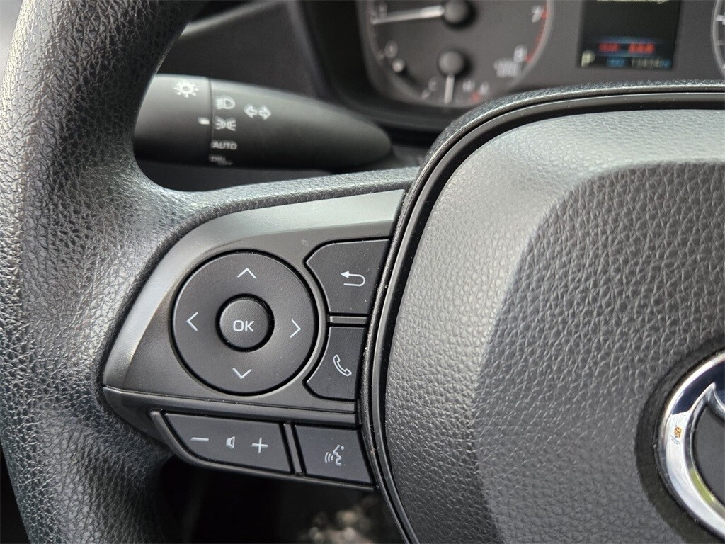 This vehicle comes equipped with 4-Wheel Disc Brakes, 6 Speakers, ABS brakes, Air Conditioning, AM/FM radio: SiriusXM, Auto High-beam Headlights, Automatic temperature control, Brake assist, Bumpers: body-color, Delay-off headlights, Driver door bin, Driver vanity mirror, Dual front impact airbags, Dual front side impact airbags, Electronic Stability Control, Emergency communication system: Safety Connect (up to 10-year trial subscription), Exterior Parking Camera Rear, Front anti-roll bar, Front Bucket Seats, Front Center Armrest, Front reading lights, Front wheel independent suspension, Fully automatic headlights, Illuminated entry, Knee airbag, Low tire pressure warning, Occupant sensing airbag, Outside temperature display, Overhead airbag, Panic alarm, Passenger door bin, Passenger vanity mirror, Power door mirrors, Power steering, Power windows, Premium Fabric Seat Trim, Radio data system, Radio: 8" Toyota Audio Multimedia, Rear anti-roll bar, Rear seat center armrest, Rear side impact airbag, Rear window defroster, Remote keyless entry, Speed control, Split folding rear seat, Steering wheel mounted audio controls, Tachometer, Telescoping steering wheel, Tilt steering wheel, Traction control, Trip computer, Variably intermittent wipers, and Wheels: 16" Wide Vent Steel .