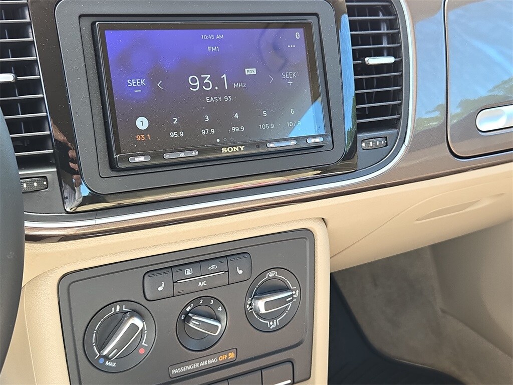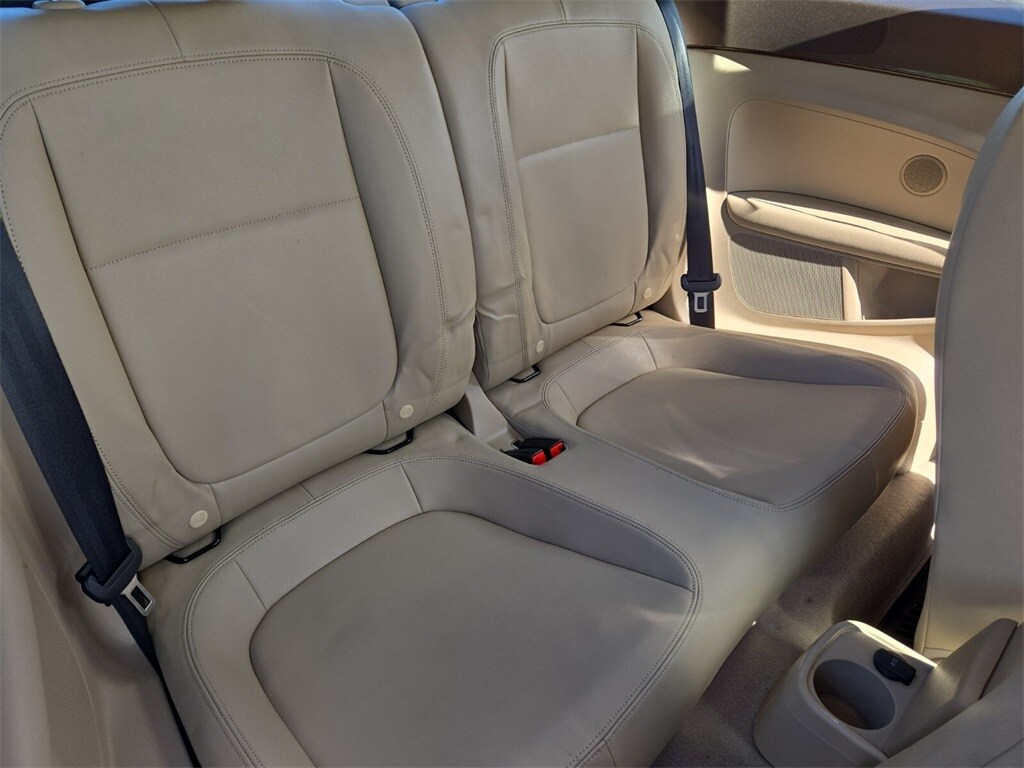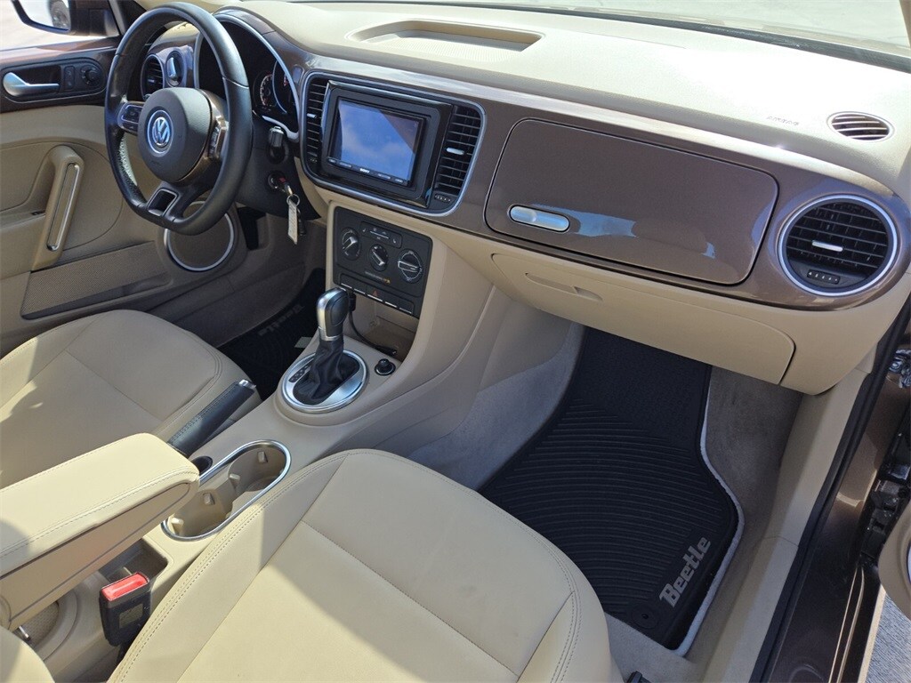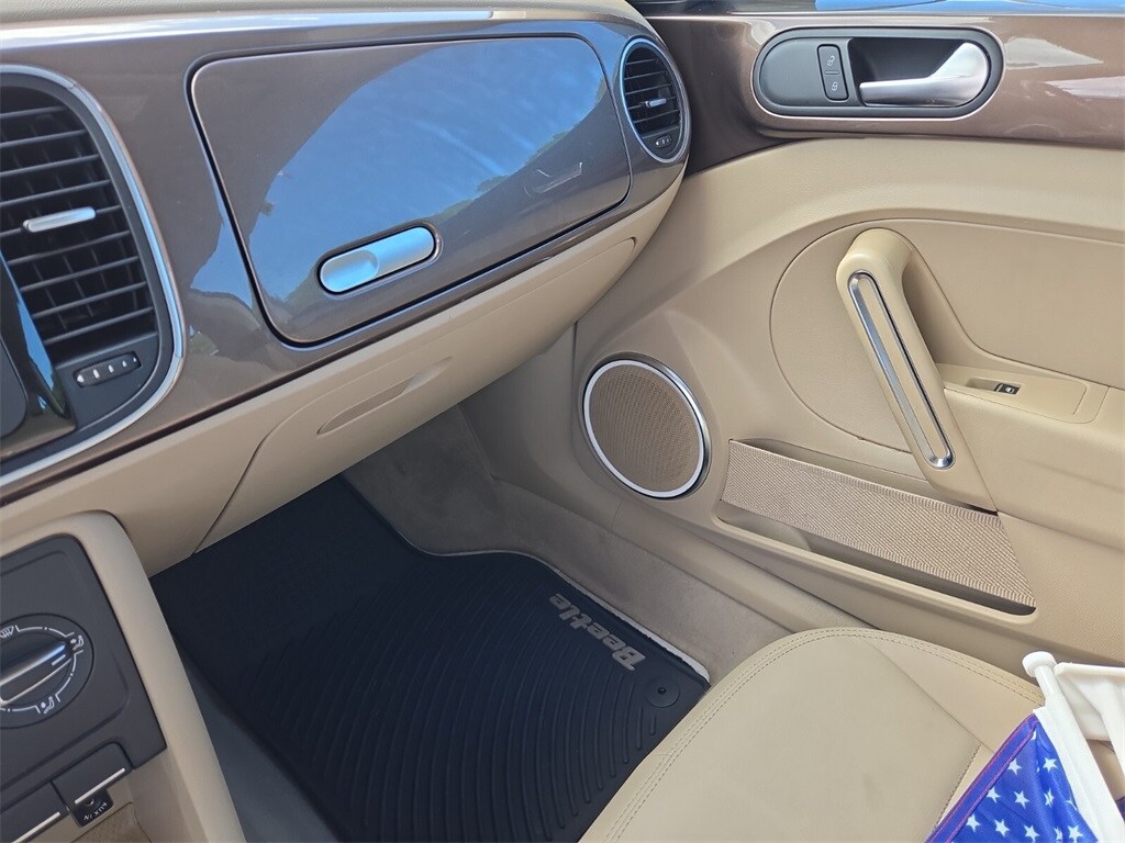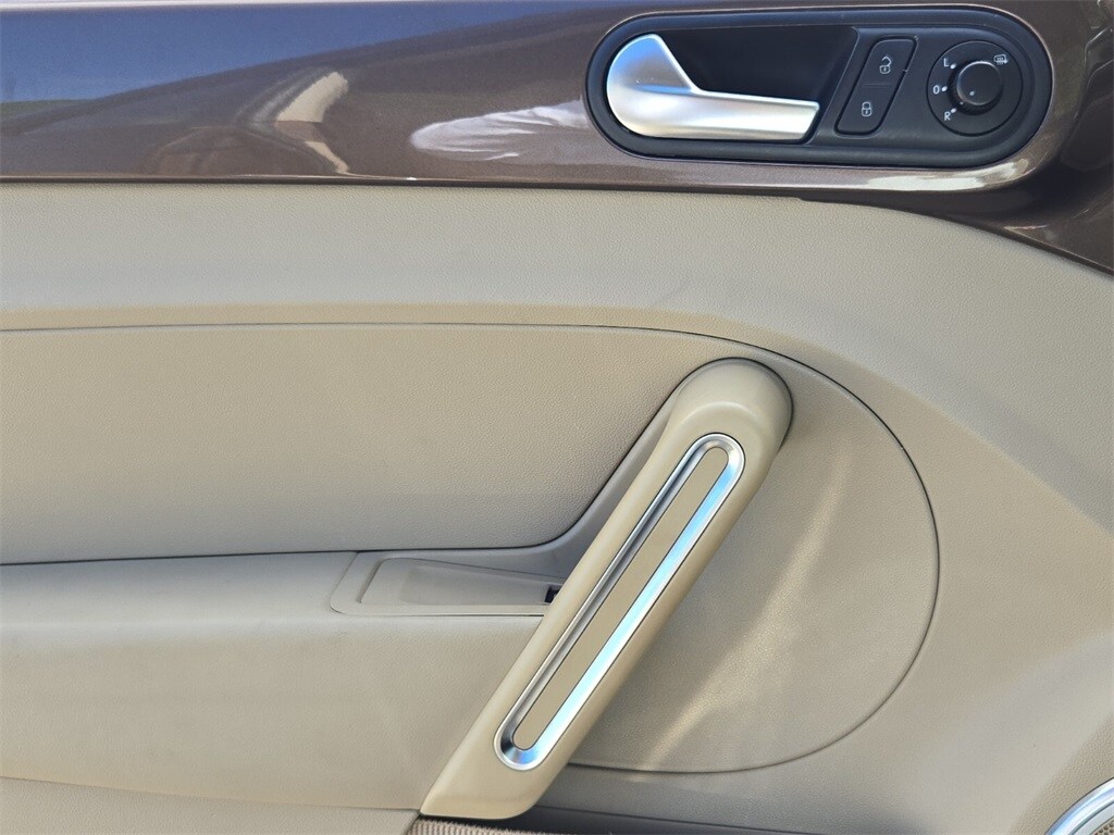 This vehicle comes equipped with Beige Artificial Leather, 4-Wheel Disc Brakes, ABS brakes, Air Conditioning, Alloy wheels, Beetle Black Graphics Kit, Bodyside moldings, Brake assist, Bumpers: body-color, CD player, Driver door bin, Driver vanity mirror, Dual front impact airbags, Dual front side impact airbags, Electronic Stability Control, Emergency communication system: Car-Net, First Aid Kit, Four wheel independent suspension, Front anti-roll bar, Front Bucket Seats, Front Center Armrest w/Storage, Front reading lights, Heatable Front Bucket Seats, Heated door mirrors, Heated front seats, Illuminated entry, Leather steering wheel, Low tire pressure warning, Occupant sensing airbag, Outside temperature display, Overhead console, Panic alarm, Passenger door bin, Passenger vanity mirror, Power door mirrors, Power steering, Power windows, Radio data system, Rear anti-roll bar, Rear reading lights, Rear window defroster, Remote keyless entry, Security Wheel Locks (Set of 4), Speed control, Split folding rear seat, Steering wheel mounted audio controls, Tachometer, Telescoping steering wheel, Tilt steering wheel, Traction control, Trip computer, Turn signal indicator mirrors, V-Tex Leatherette Seating Surfaces, and Variably intermittent wipers .
