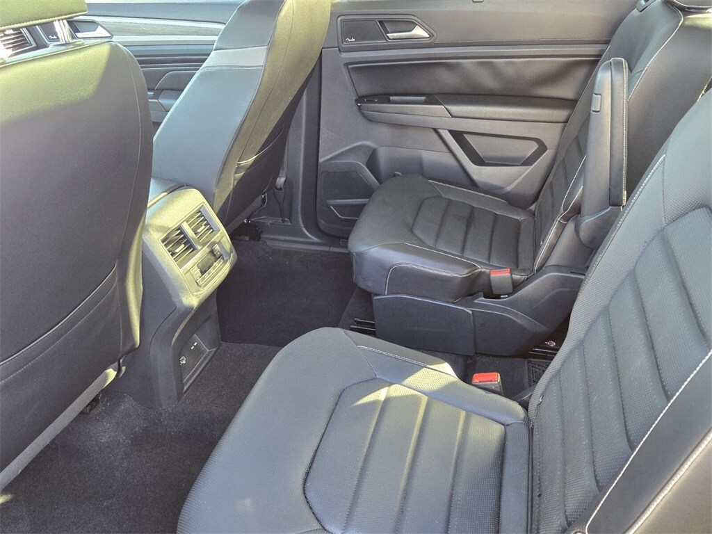 This vehicle comes equipped with 12 Speakers, 2nd-Row Dual Captain's Chairs, 3.60 Axle Ratio, 3rd row seats: split-bench, 4-Wheel Disc Brakes, ABS brakes, Air Conditioning, Alloy wheels, Auto High-beam Headlights, Auto-dimming Rear-View mirror, Automatic temperature control, Brake assist, Bumpers: body-color, Compass, Delay-off headlights, Driver door bin, Driver vanity mirror, Dual front impact airbags, Dual front side impact airbags, Electronic Stability Control, Emergency communication system: VW Car-Net services (capabilities require enrollment or subscription), Four wheel independent suspension, Front anti-roll bar, Front Bucket Seats, Front Center Armrest, Front dual zone A/C, Front fog lights, Front reading lights, Fully automatic headlights, Heated door mirrors, Heated front seats, Heated rear seats, Heated steering wheel, Heavy Duty Trunk Liner w/VW CarGo Blocks, Htd/Actively Ventilated Comfort Front Sport Seats, Illuminated entry, Leather Shift Knob, Low tire pressure warning, Memory seat, Navigation System, Occupant sensing airbag, Outside temperature display, Overhead airbag, Overhead console, Panic alarm, Passenger door bin, Passenger vanity mirror, Perforated Vienna Leather Seating Surfaces, Power door mirrors, Power driver seat, Power Liftgate, Power moonroof, Power passenger seat, Power steering, Power windows, Privacy Cover, Radio data system, Rain sensing wipers, Rear air conditioning, Rear anti-roll bar, Rear audio controls, Rear reading lights, Rear seat center armrest, Rear window defroster, Rear window wiper, Remote keyless entry, Roadside Assistance Kit, Roof rack: rails only, Rubber Mats Kit - Captain's Chairs, Security system, Speed control, Speed-sensing steering, Split folding rear seat, Spoiler, Standard Suspension, Steering wheel mounted audio controls, Tachometer, Telescoping steering wheel, Tilt steering wheel, Traction control, Trip computer, Turn signal indicator mirrors, Variably intermittent wipers, Ventilated front seats, and Wheels: 20" 5-Spoke 2-Tone Machined Alloy .
