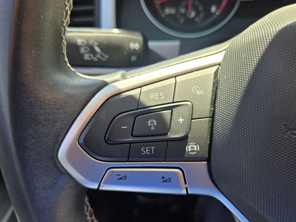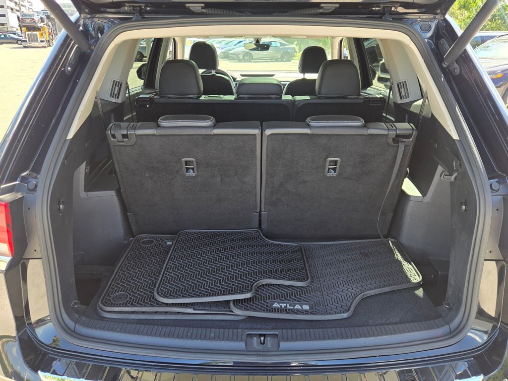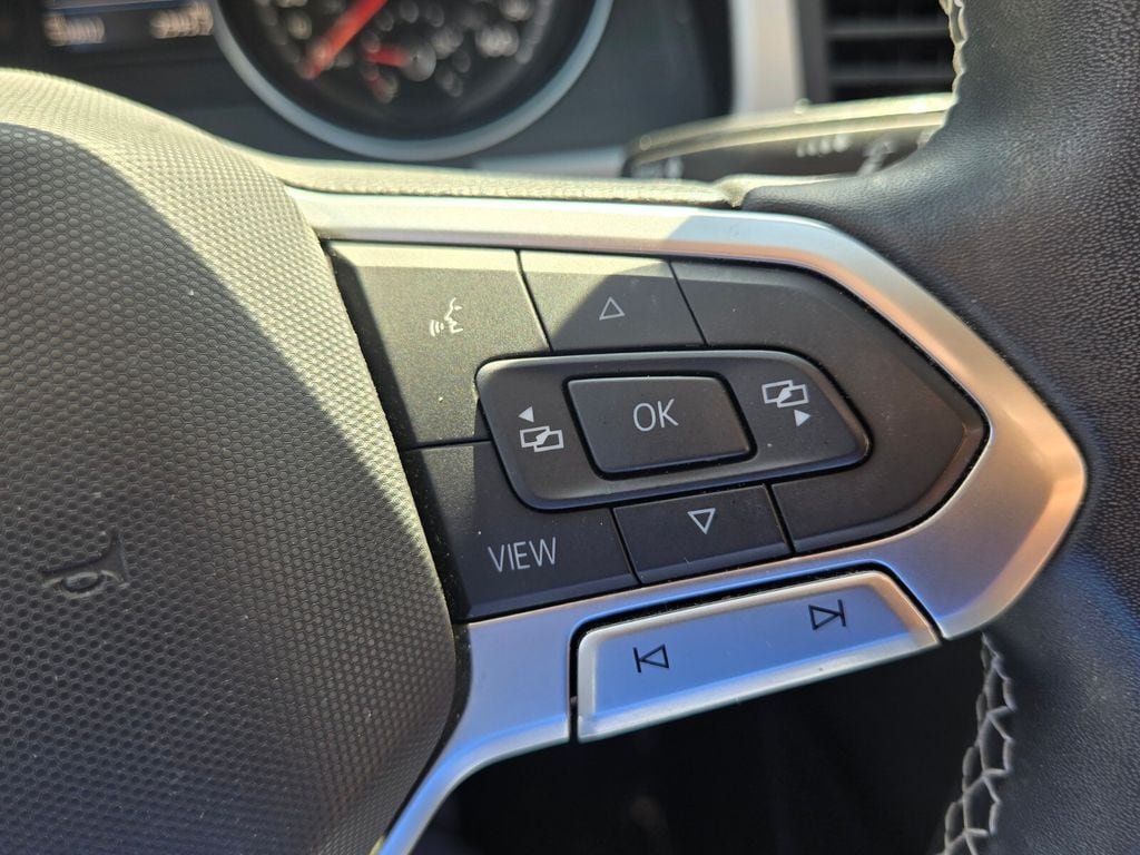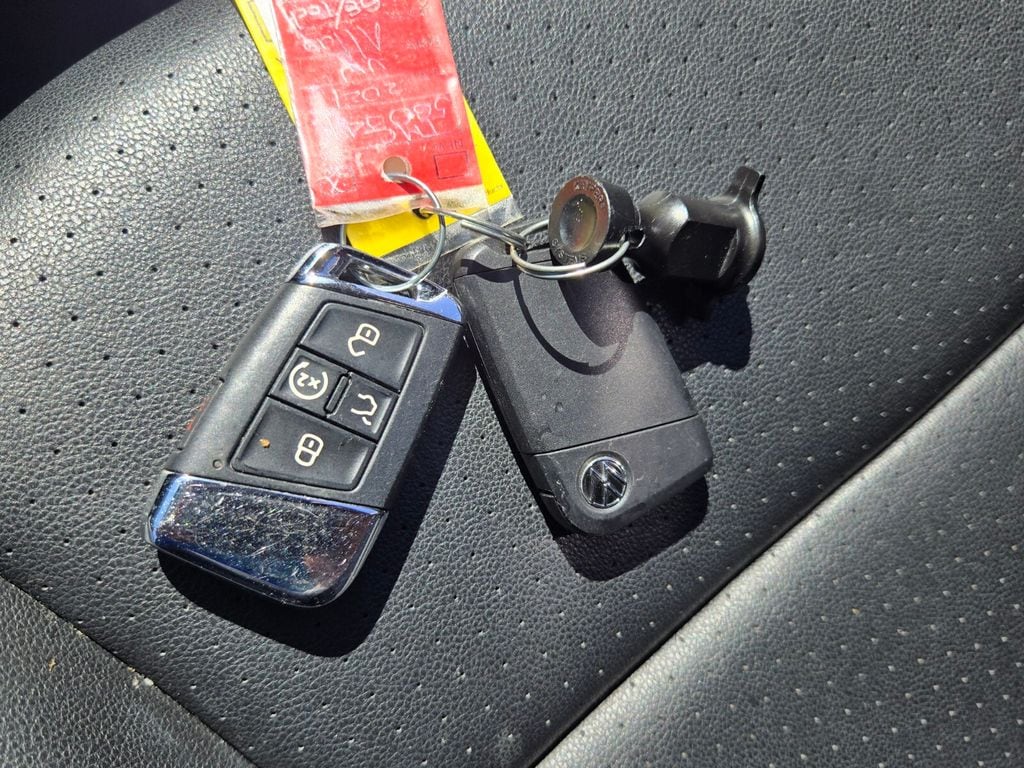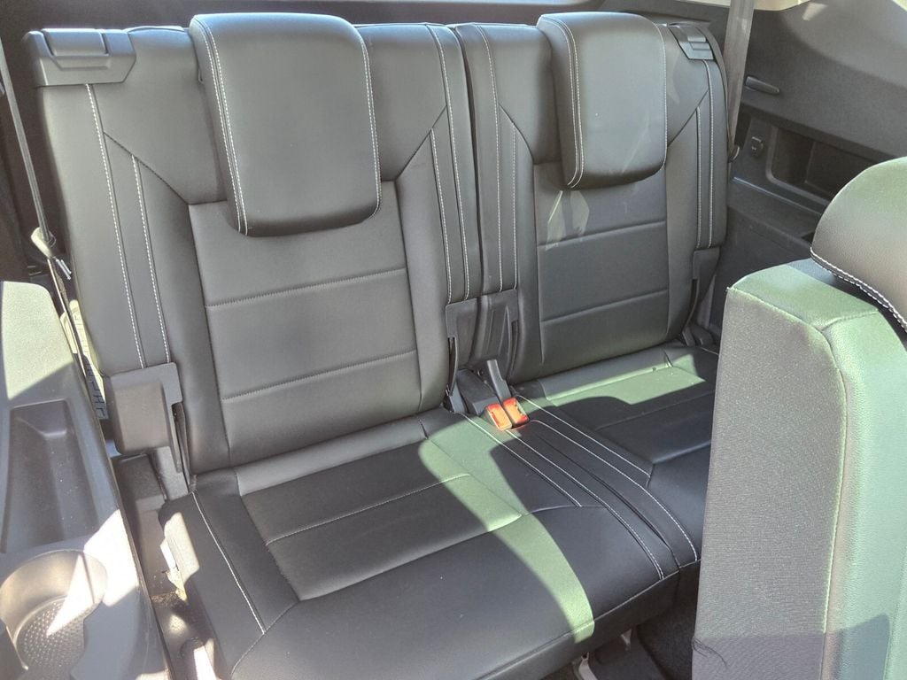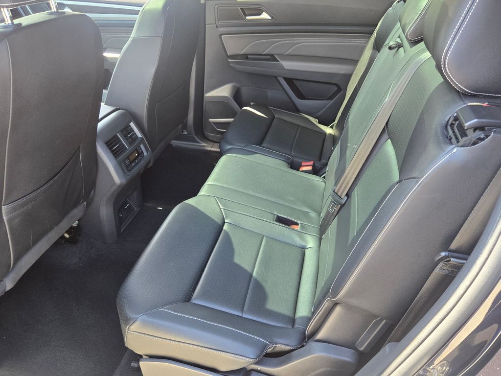 This vehicle comes equipped with Panoramic Sunroof Package, Towing Package, 3.60 Axle Ratio, 3rd row seats: split-bench, 4-Wheel Disc Brakes, 6 Speakers, ABS brakes, Air Conditioning, Alloy wheels, Auto-dimming Rear-View mirror, Automatic temperature control, Brake assist, Bumpers: body-color, Compass, Delay-off headlights, Driver door bin, Driver vanity mirror, Dual front impact airbags, Dual front side impact airbags, Electronic Stability Control, Emergency communication system: VW Car-Net services (capabilities require enrollment or subscription), Exterior Parking Camera Rear, Forward collision: FCW w/Autonomous Emergency Braking mitigation, Four wheel independent suspension, Frameless Self-Dimming Rearview Mirror, Front anti-roll bar, Front Bucket Seats, Front Center Armrest, Front dual zone A/C, Front fog lights, Front reading lights, Fully automatic headlights, Heated Comfort Front Bucket Seats, Heated door mirrors, Heated front seats, Heavy Duty Trunk Liner w/VW CarGo Blocks, Illuminated entry, Leather Shift Knob, Low tire pressure warning, Occupant sensing airbag, Outside temperature display, Overhead airbag, Overhead console, Panic alarm, Passenger door bin, Passenger vanity mirror, Perforated V-Tex Leatherette Seating Surfaces, Power door mirrors, Power driver seat, Power Liftgate, Power steering, Power windows, Privacy Cover, Radio data system, Rain sensing wipers, Rear air conditioning, Rear anti-roll bar, Rear reading lights, Rear seat center armrest, Rear window defroster, Rear window wiper, Remote keyless entry, Roof rack: rails only, Rubber Mats Kit - Bench Seat, Security system, Speed control, Speed-sensing steering, Split folding rear seat, Spoiler, Standard Suspension, Steering wheel mounted audio controls, Tachometer, Telescoping steering wheel, Tilt steering wheel, Traction control, Trip computer, Turn signal indicator mirrors, Variably intermittent wipers, and Wheels: 20" 5-Spoke Silver Alloy .