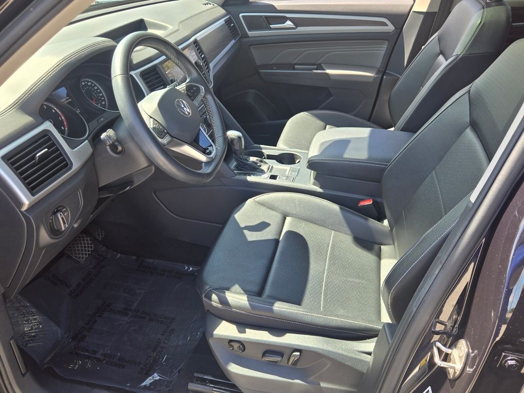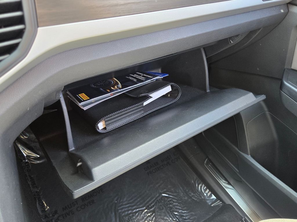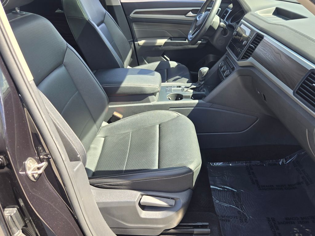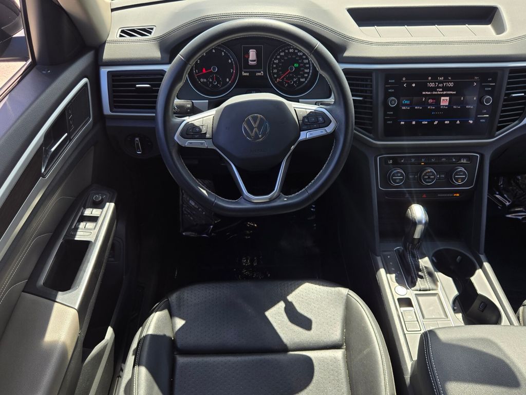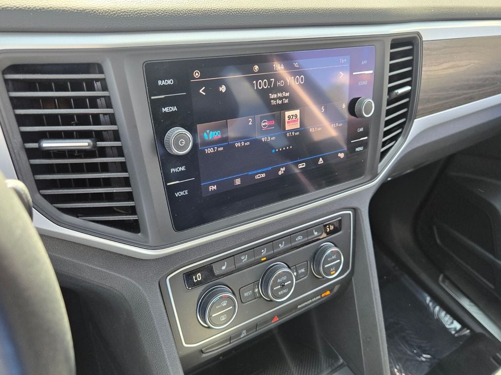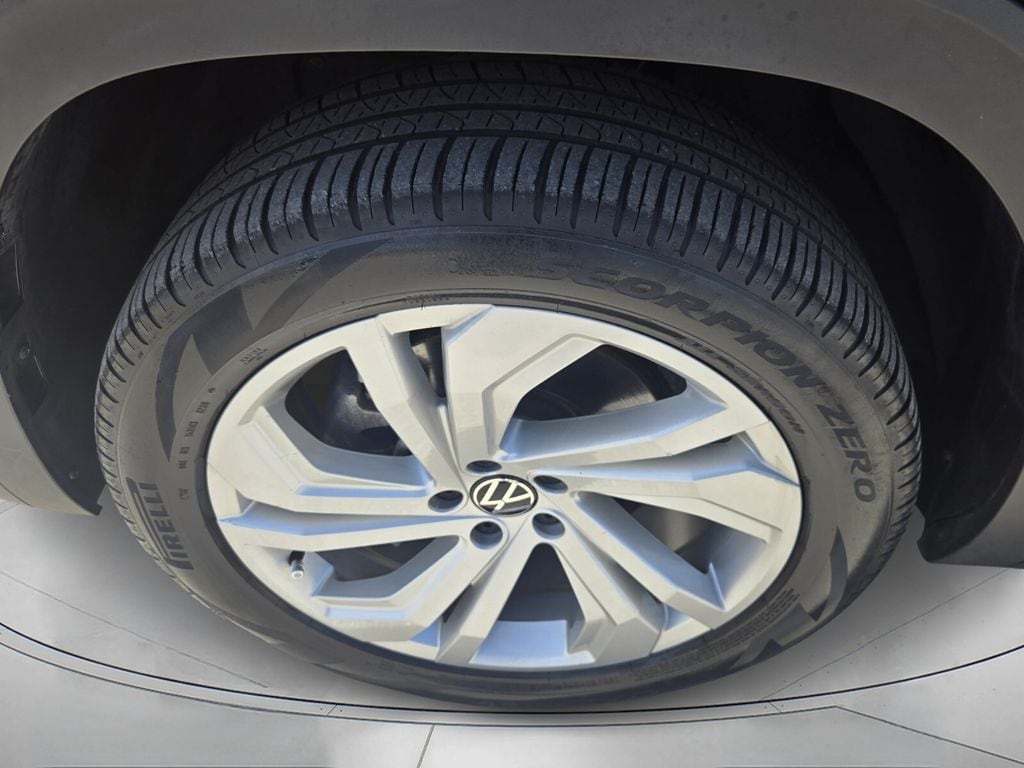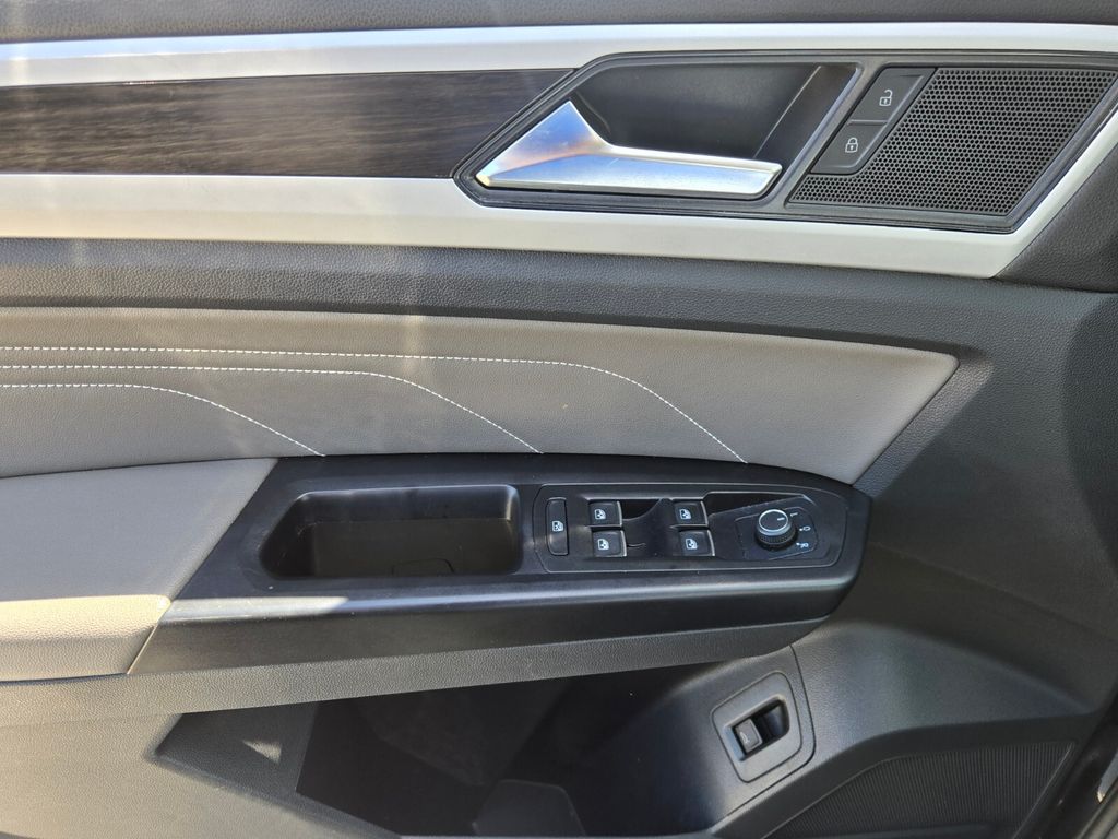 This vehicle comes equipped with Panoramic Sunroof Package, Towing Package, 3.60 Axle Ratio, 3rd row seats: split-bench, 4-Wheel Disc Brakes, 6 Speakers, ABS brakes, Air Conditioning, Alloy wheels, Auto-dimming Rear-View mirror, Automatic temperature control, Brake assist, Bumpers: body-color, Compass, Delay-off headlights, Driver door bin, Driver vanity mirror, Dual front impact airbags, Dual front side impact airbags, Electronic Stability Control, Emergency communication system: VW Car-Net services (capabilities require enrollment or subscription), Exterior Parking Camera Rear, Forward collision: FCW w/Autonomous Emergency Braking mitigation, Four wheel independent suspension, Frameless Self-Dimming Rearview Mirror, Front anti-roll bar, Front Bucket Seats, Front Center Armrest, Front dual zone A/C, Front fog lights, Front reading lights, Fully automatic headlights, Heated Comfort Front Bucket Seats, Heated door mirrors, Heated front seats, Heavy Duty Trunk Liner w/VW CarGo Blocks, Illuminated entry, Leather Shift Knob, Low tire pressure warning, Occupant sensing airbag, Outside temperature display, Overhead airbag, Overhead console, Panic alarm, Passenger door bin, Passenger vanity mirror, Perforated V-Tex Leatherette Seating Surfaces, Power door mirrors, Power driver seat, Power Liftgate, Power steering, Power windows, Privacy Cover, Radio data system, Rain sensing wipers, Rear air conditioning, Rear anti-roll bar, Rear reading lights, Rear seat center armrest, Rear window defroster, Rear window wiper, Remote keyless entry, Roof rack: rails only, Rubber Mats Kit - Bench Seat, Security system, Speed control, Speed-sensing steering, Split folding rear seat, Spoiler, Standard Suspension, Steering wheel mounted audio controls, Tachometer, Telescoping steering wheel, Tilt steering wheel, Traction control, Trip computer, Turn signal indicator mirrors, Variably intermittent wipers, and Wheels: 20" 5-Spoke Silver Alloy .