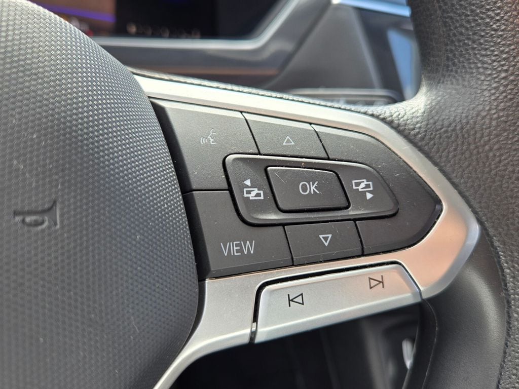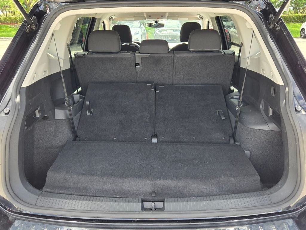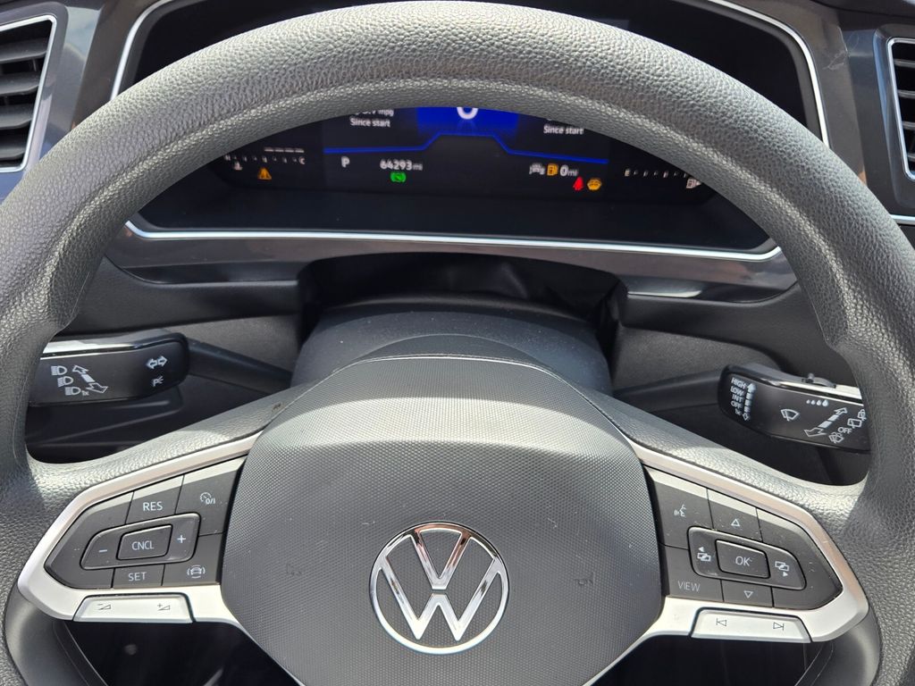 This vehicle comes equipped with 3-Row Rubber Monster Mats w/Logo Kit (Set of 5), 3.33 Axle Ratio, 3rd row seats: bench, 4-Wheel Disc Brakes, 4-Wheel Independent Suspension, 6 Speakers, ABS brakes, Air Conditioning, Alloy wheels, AM/FM radio, Brake assist, Bumpers: body-color, Cloth Seating Surfaces, Compass, Credit - Rear Sensors Removed, Delay-off headlights, Driver door bin, Driver vanity mirror, Dual front impact airbags, Dual front side impact airbags, Electronic Stability Control, Emergency communication system: VW Car-Net Safe & Secure 5-year, Exterior Parking Camera Rear, First Aid Kit, Forward collision: FCW w/Autonomous Emergency Braking mitigation, Four wheel independent suspension, Front anti-roll bar, Front Bucket Seats, Front Center Armrest, Front reading lights, Fully automatic headlights, Heated door mirrors, Heated Front Bucket Seats, Heated front seats, Heavy Duty Trunk Liner w/VW CarGo Blocks, Illuminated entry, Leather Shift Knob, Low tire pressure warning, Occupant sensing airbag, Outside temperature display, Overhead airbag, Overhead console, Panic alarm, Passenger door bin, Passenger vanity mirror, Power door mirrors, Power steering, Power windows, Radio data system, Radio: Composition Color AM/FM, Rear anti-roll bar, Rear reading lights, Rear seat center armrest, Rear window defroster, Rear window wiper, Remote keyless entry, Roadside Assistance Kit, Speed control, Speed-sensing steering, Split folding rear seat, Spoiler, Steering wheel mounted audio controls, Tachometer, Telescoping steering wheel, Tilt steering wheel, Traction control, Trip computer, Turn signal indicator mirrors, Variably intermittent wipers, and Wheels: 17" 2-Tone Machined Twin 5-Spoke Alloy .
