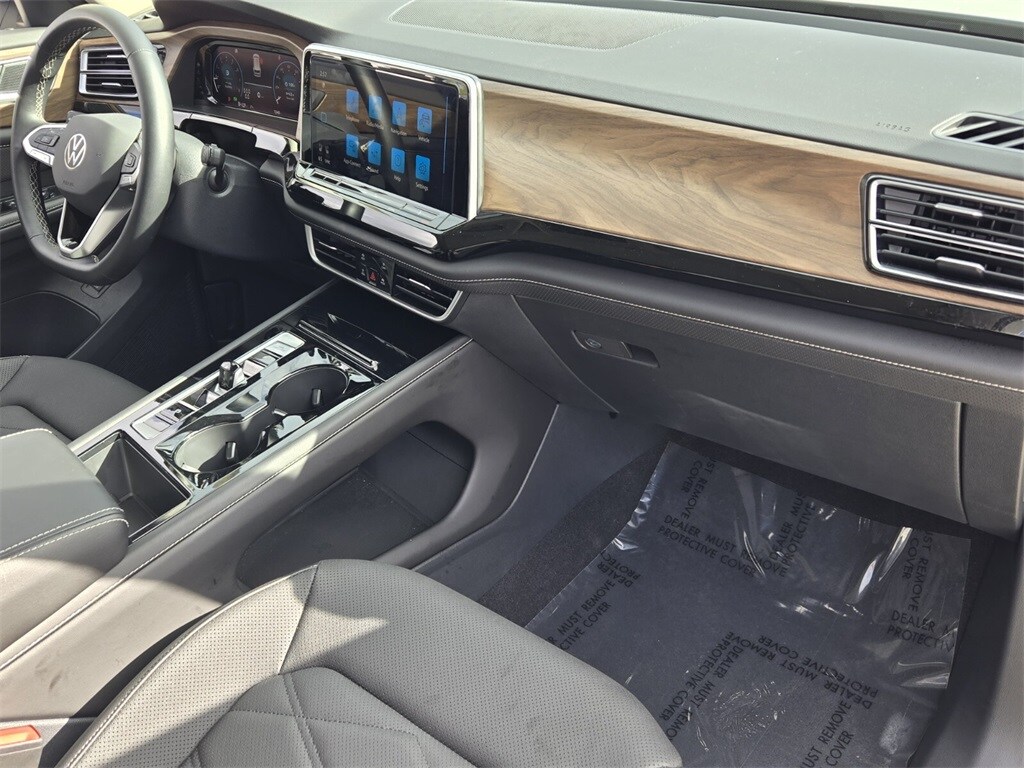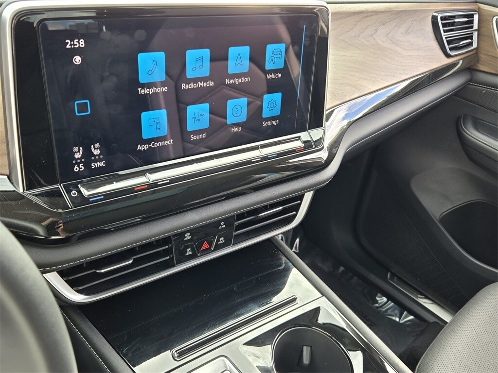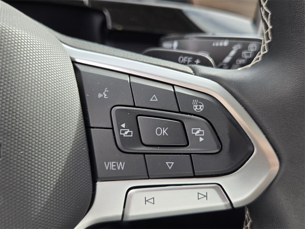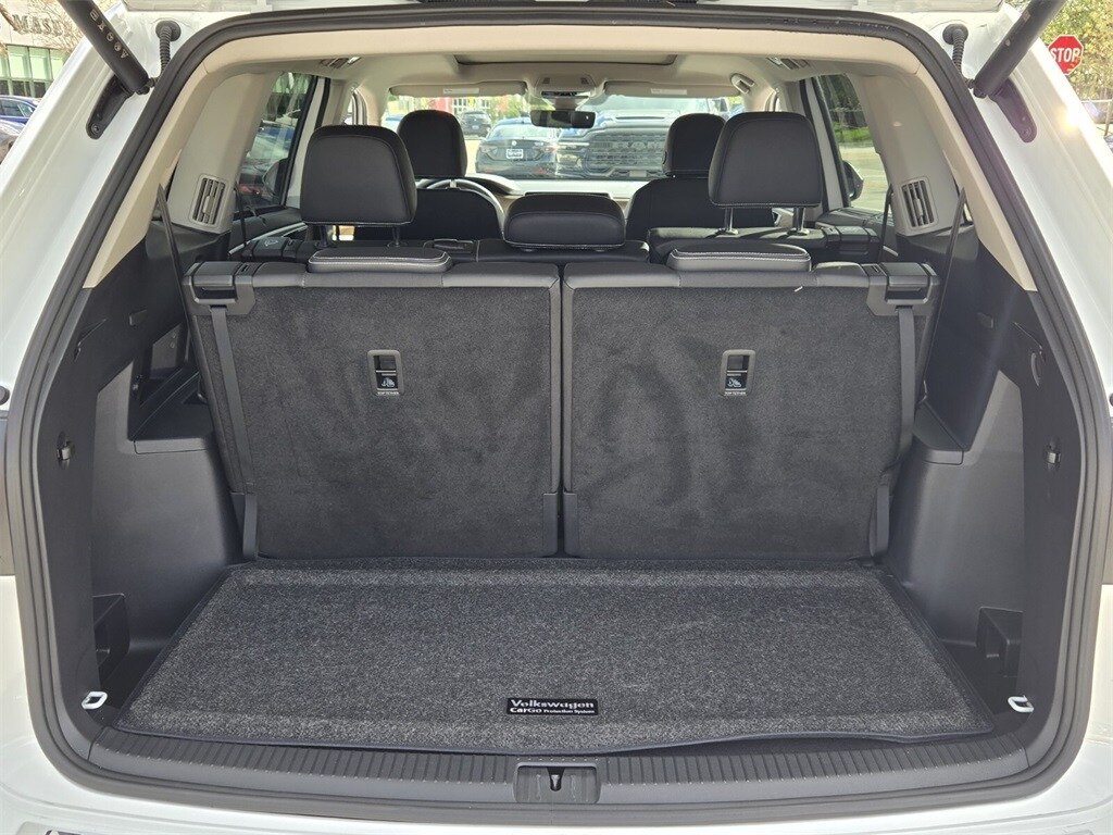 This vehicle comes equipped with 20" 2-tone machined alloy wheels, 3rd row seats: split-bench, 4-Wheel Disc Brakes, 6 Speakers, ABS brakes, Air Conditioning, Alloy wheels, AM/FM radio: SiriusXM with 360L, Auto High-beam Headlights, Auto-dimming Rear-View mirror, Automatic temperature control, Brake assist, Bumpers: body-color, Compass, Delay-off headlights, Driver door bin, Driver vanity mirror, Dual front impact airbags, Dual front side impact airbags, Electronic Stability Control, Emergency communication system: VW Car-Net Safe & Secure 5-year, Exterior Parking Camera Rear, Four wheel independent suspension, four-wheel independent suspension, Front anti-roll bar, Front Bucket Seats, Front Center Armrest, Front dual zone A/C, Front fog lights, Front reading lights, Fully automatic headlights, heated and Actively ventilated front bucket seats, Heated door mirrors, Heated front seats, Heated steering wheel, Illuminated entry, Low tire pressure warning, MIB3 composition media radio, Occupant sensing airbag, Outside temperature display, Overhead airbag, Overhead console, Panic alarm, Passenger door bin, Passenger vanity mirror, perforated V-Tex leatherette seating surfaces, Power door mirrors, Power driver seat, Power Liftgate, Power steering, Power windows, Radio data system, Rain sensing wipers, Rear air conditioning, Rear anti-roll bar, Rear reading lights, Rear seat center armrest, Rear window defroster, Rear window wiper, Remote keyless entry, Security system, Speed control, Speed-sensing steering, Split folding rear seat, Spoiler, Steering wheel mounted audio controls, Tachometer, Telescoping steering wheel, Tilt steering wheel, Traction control, Trip computer, Turn signal indicator mirrors, Variably intermittent wipers, and Ventilated front seats .