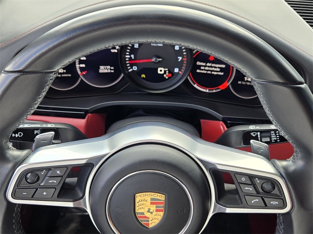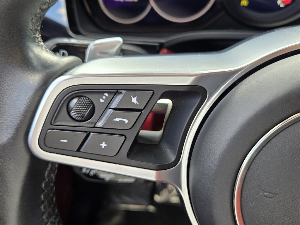 This vehicle comes equipped with Leather, 14 Speakers, 4-Wheel Disc Brakes, 8-Way Sport Seats, ABS brakes, Adaptive suspension, Air Conditioning, Alloy wheels, AM/FM radio: SiriusXM, Apple CarPlay, Auto-dimming door mirrors, Auto-dimming Rear-View mirror, Automatic temperature control, Axle Ratio: 3.480, Brake assist, Bumpers: body-color, Delay-off headlights, Driver door bin, Driver vanity mirror, Dual front impact airbags, Dual front side impact airbags, Electronic Stability Control, Exterior Parking Camera Rear, Four wheel independent suspension, Front anti-roll bar, Front Bucket Seats, Front Center Armrest, Front dual zone A/C, Front reading lights, Fully automatic headlights, Garage door transmitter: HomeLink, Heated door mirrors, Heated front seats, Illuminated entry, Knee airbag, Leather Seat Trim, Leather Shift Knob, Low tire pressure warning, Navigation System, Occupant sensing airbag, Outside temperature display, Overhead airbag, Overhead console, Panic alarm, Passenger door bin, Passenger vanity mirror, Porsche Communication Management, Power door mirrors, Power driver seat, Power Liftgate, Power moonroof: Panoramic, Power passenger seat, Power steering, Power windows, Radio data system, Rain sensing wipers, Rear anti-roll bar, Rear fog lights, Rear reading lights, Rear seat center armrest, Rear side impact airbag, Rear window defroster, Rear window wiper, Remote keyless entry, Security system, Speed control, Speed-sensing steering, Split folding rear seat, Spoiler, Steering wheel mounted audio controls, Tachometer, Telescoping steering wheel, Tilt steering wheel, Traction control, Trip computer, Turn signal indicator mirrors, Variably intermittent wipers, Voltmeter, and Wheels: 21" RS Spyder Design in Satin Platinum .