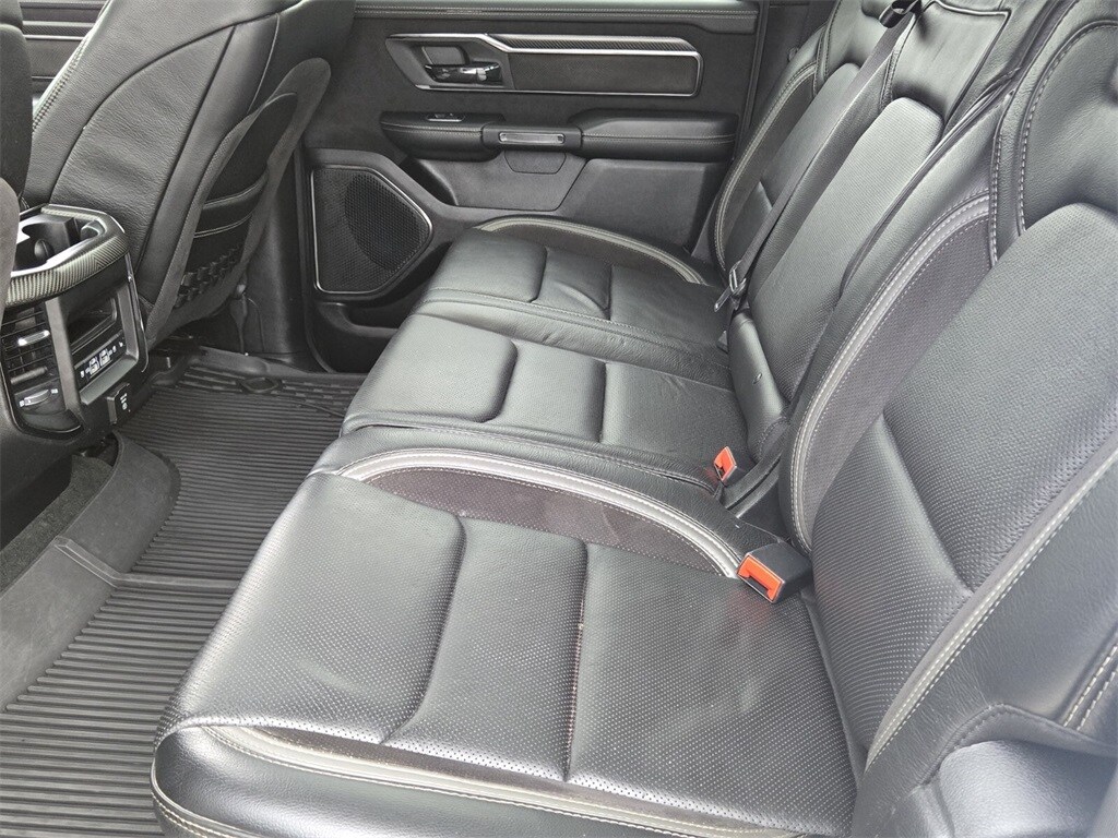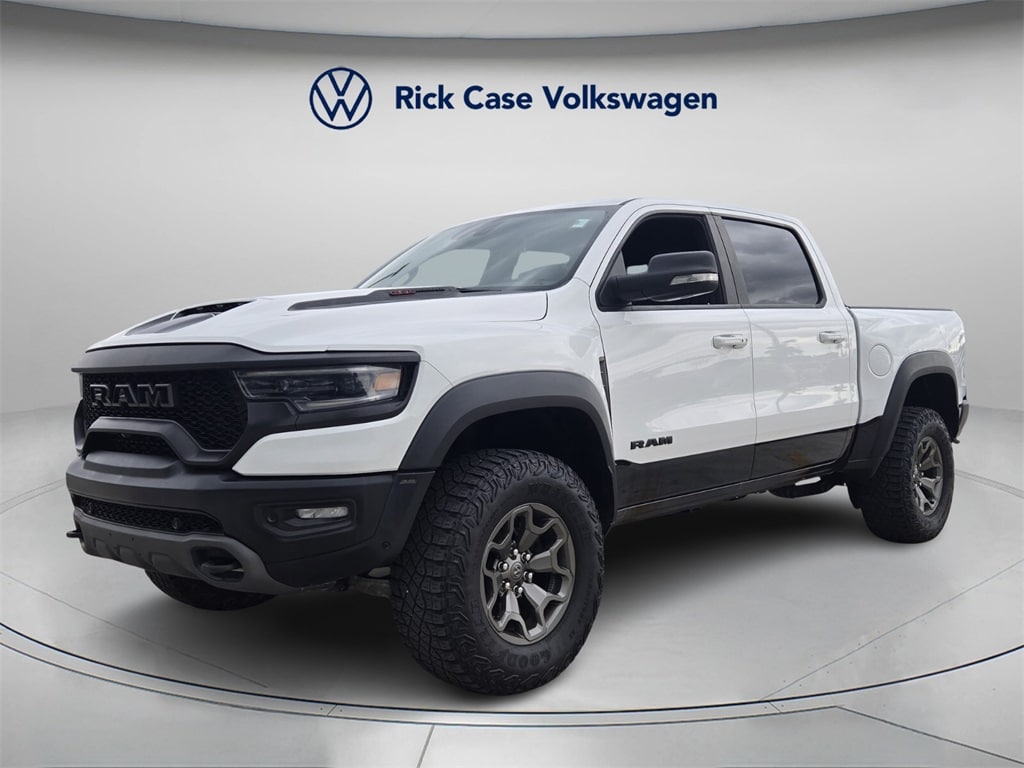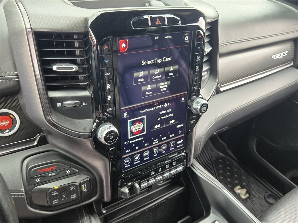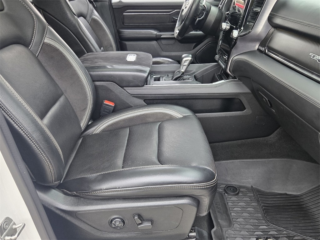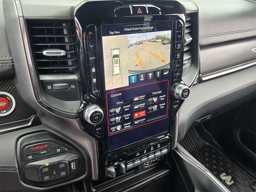 This vehicle comes equipped with Bed Utility Group (MOPAR 4 Adjustable Cargo Tie-Down Hooks, MOPAR Deployable Bed Step, and MOPAR Spray In Bedliner), Quick Order Package 29Y, Technology Group (Heads-Up Display, LED CHMSL Lamp, and Rearview Autodim Digital Display Mirror), TRX Carbon Fiber Package (Leather/Carbon Flat-Bottom Steering Wheel and Real Carbon Fiber Interior Accents), TRX Level 2 Equipment Group (4 Way Front Headrests, Blind Spot & Cross Path Detection, Body Color Door Handles, Bucket Seats, Driver Seat Memory, Driver/Passenger Wrapped Assist Handles, Exterior Mirrors w/Memory, Front Door Accent Lighting, Full Length Premium Upgraded Floor Console, Heated Front Seats, Heated Second Row Seats, Heated Steering Wheel, IP LED Ambient Light Pipe, Leather Trimmed Bucket Seats, Leather/Suede Flat-Bottom Steering Wheel, Luxury Front Door Trim Panel, ParkSense Front/Rear Park Assist w/Stop, Pick-Up Box Lighting, Power 4-Way Driver Lumbar Adjust, Power 4-Way Passenger Lumbar Adjust, Power 8-Way Driver & Passenger Seats, Power Adjustable Pedals w/Memory, Premium Wrapped IP Bezel, Radio/Driver Seat/Mirrors/Pedals Memory, Rain Sensitive Windshield Wipers, Rear 60/40 Folding Split Recline Seat, Rear Door Accent Lighting, Rear Underseat Compartment Storage, Rear Window Defroster, Remote Proximity Keyless Entry, Remote Start System, Remote Tailgate Release, Sun Visors w/Illuminated Vanity Mirrors, Surround View Camera System, Trailer Brake Control, Universal Garage Door Opener, Ventilated Front Seats, Ventilated Rear Seats, and Wireless Charging Pad), 10 Speakers, 3.55 Rear Axle Ratio, 4-Wheel Disc Brakes, ABS brakes, Adaptive suspension, Air Conditioning, Alloy wheels, AM/FM radio: SiriusXM with 360L, Apple CarPlay/Android Auto, Auto High-beam Headlights, Auto-dimming door mirrors, Auto-dimming Rear-View mirror, Automatic temperature control, Black Exterior Mirrors, Brake assist, Cloth/Vinyl Bucket Seats, Compass, Delay-off headlights, Dome Dual LED Reading Lamp, Driver door bin, Dual front impact airbags, Dual front side impact airbags, Dual-Pane Panoramic Sunroof, Electronic Stability Control, Emergency communication system: SiriusXM Guardian, Exterior Mirrors Courtesy Lamps, Exterior Mirrors w/Heating Element, Exterior Mirrors w/Supplemental Signals, Front anti-roll bar, Front Bucket Seats, Front Center Armrest w/Storage, Front dual zone A/C, Front fog lights, Front License Plate Bracket, Front reading lights, Front wheel independent suspension, Fully automatic headlights, Heated door mi