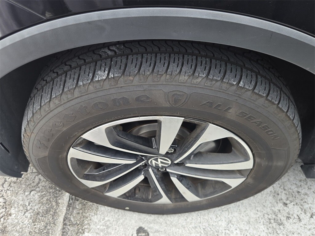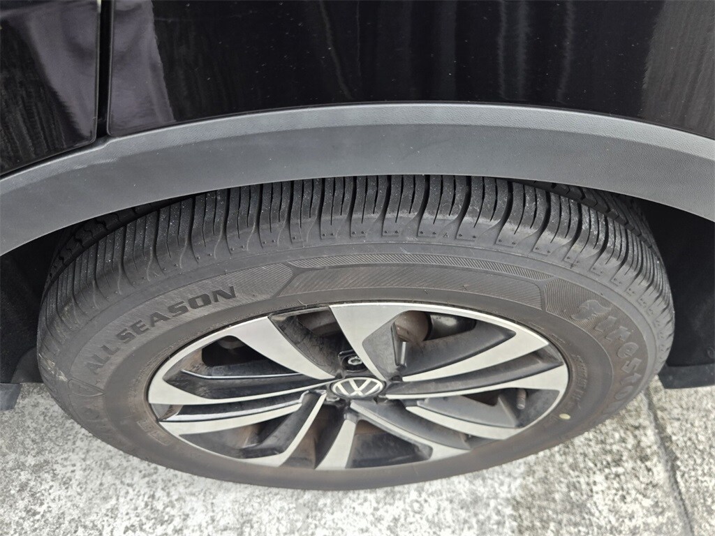 This vehicle comes equipped with 3-Row Rubber Monster Mats w/Logo Kit (Set of 5), 3.33 Axle Ratio, 3rd row seats: bench, 4-Wheel Disc Brakes, 4-Wheel Independent Suspension, 6 Speakers, ABS brakes, Air Conditioning, Alloy wheels, AM/FM radio, Brake assist, Bumpers: body-color, Cloth Seating Surfaces, Compass, Credit - Rear Sensors Removed, Delay-off headlights, Driver door bin, Driver vanity mirror, Dual front impact airbags, Dual front side impact airbags, Electronic Stability Control, Emergency communication system: VW Car-Net Safe & Secure 5-year, Exterior Parking Camera Rear, First Aid Kit, Forward collision: FCW w/Autonomous Emergency Braking mitigation, Four wheel independent suspension, Front anti-roll bar, Front Bucket Seats, Front Center Armrest, Front reading lights, Fully automatic headlights, Heated door mirrors, Heated Front Bucket Seats, Heated front seats, Heavy Duty Trunk Liner w/VW CarGo Blocks, Illuminated entry, Leather Shift Knob, Low tire pressure warning, Occupant sensing airbag, Outside temperature display, Overhead airbag, Overhead console, Panic alarm, Passenger door bin, Passenger vanity mirror, Power door mirrors, Power steering, Power windows, Radio data system, Radio: Composition Color AM/FM, Rear anti-roll bar, Rear reading lights, Rear seat center armrest, Rear window defroster, Rear window wiper, Remote keyless entry, Roadside Assistance Kit, Speed control, Speed-sensing steering, Split folding rear seat, Spoiler, Steering wheel mounted audio controls, Tachometer, Telescoping steering wheel, Tilt steering wheel, Traction control, Trip computer, Turn signal indicator mirrors, Variably intermittent wipers, and Wheels: 17" 2-Tone Machined Twin 5-Spoke Alloy .