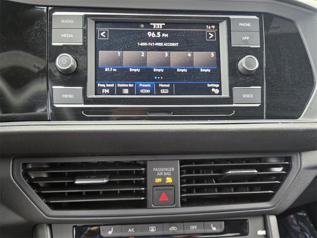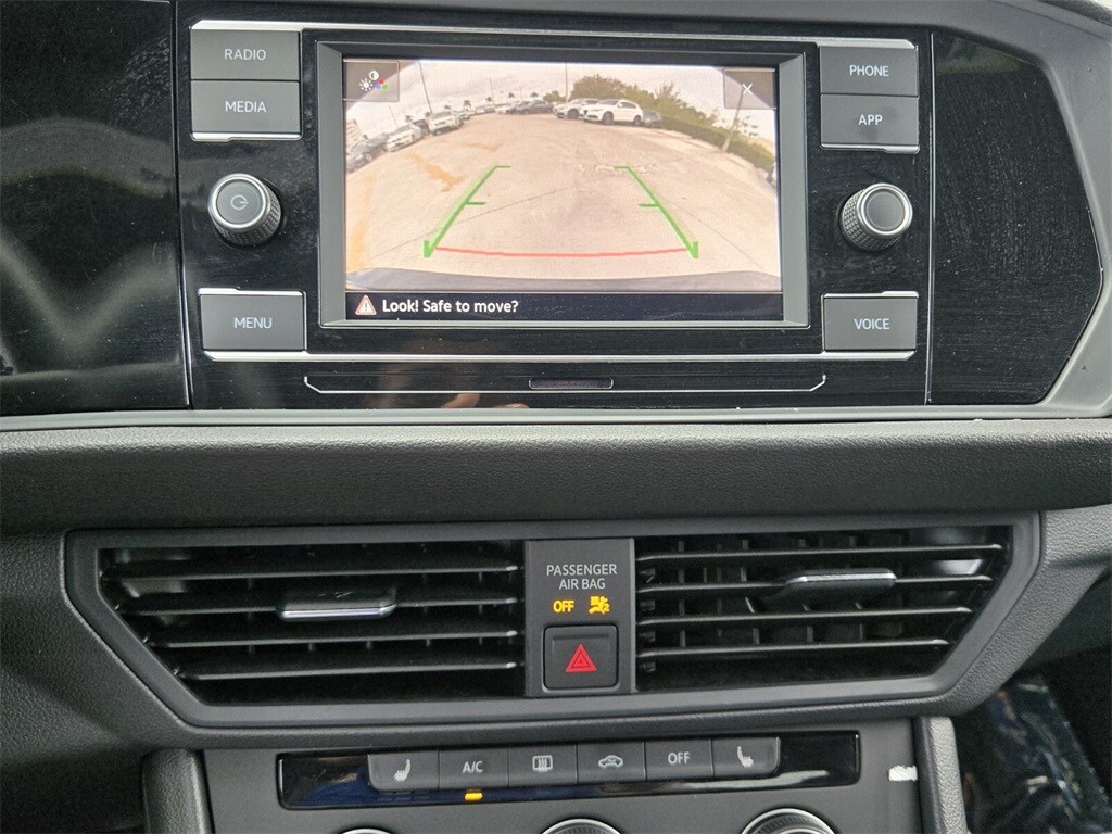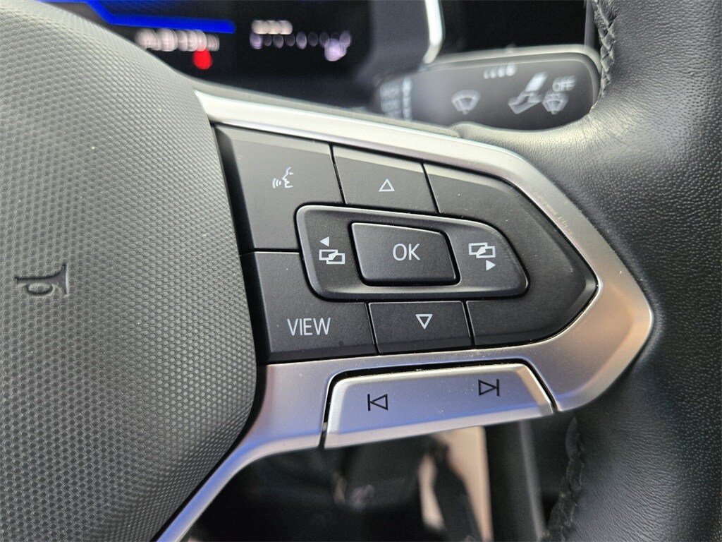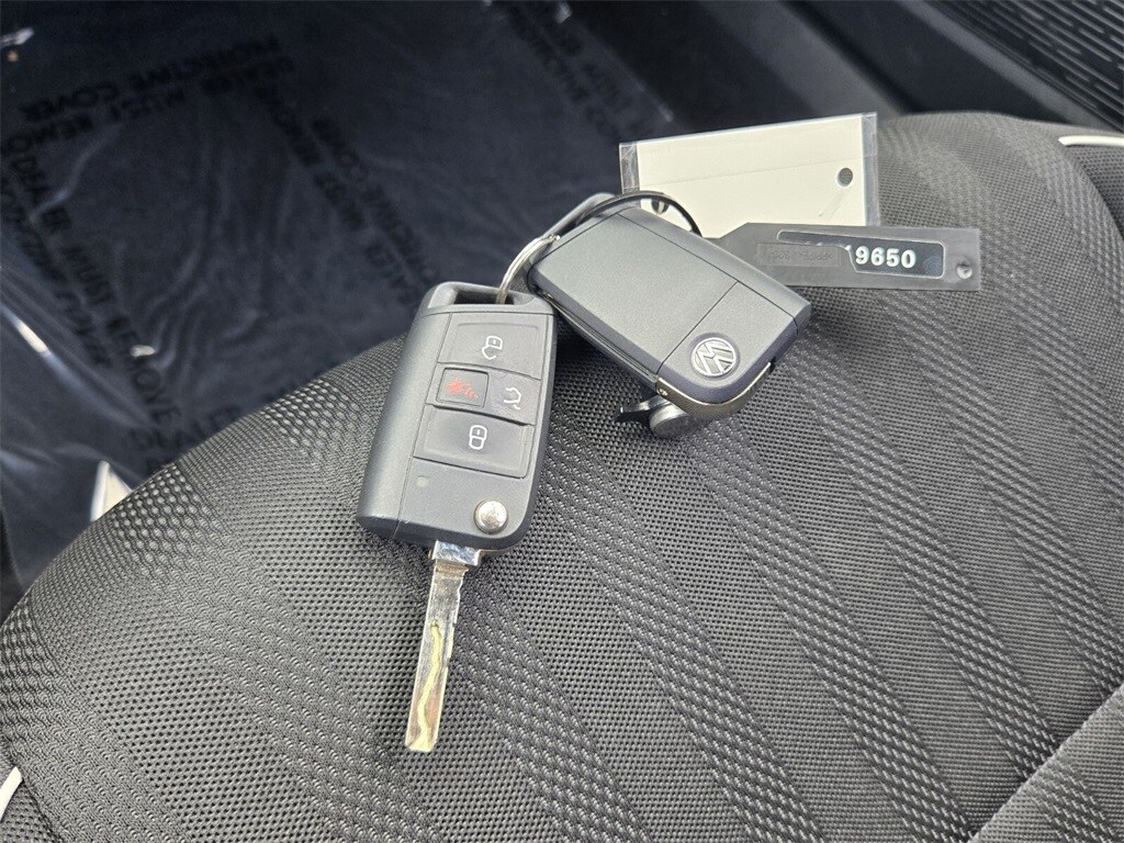 This vehicle comes equipped with Cloth, 4 Speakers, 4-Wheel Disc Brakes, ABS brakes, Active Blind Spot Monitor, Air Conditioning, Alloy wheels, Auto-dimming Rear-View mirror, Brake assist, Bumpers: body-color, Cloth Seat Trim, Delay-off headlights, Driver door bin, Driver vanity mirror, Dual front impact airbags, Dual front side impact airbags, Electronic Stability Control, Emergency communication system: VW Car-Net Safe & Secure 5-year, Exterior Parking Camera Rear, Front anti-roll bar, Front Bucket Seats, Front Center Armrest, Front wheel independent suspension, Fully automatic headlights, Heated door mirrors, Heated Front Seats, Heated front seats, Illuminated entry, Leather Shift Knob, Leather steering wheel, Low tire pressure warning, Occupant sensing airbag, Outside temperature display, Overhead airbag, Overhead console, Panic alarm, Passenger door bin, Passenger vanity mirror, Power door mirrors, Power steering, Power windows, Radio data system, Radio: MIB3 Composition Color w/6.5" Touchscreen, Rain sensing wipers, Rear anti-roll bar, Rear reading lights, Rear seat center armrest, Rear window defroster, Remote keyless entry, Speed control, Speed-sensing steering, Split folding rear seat, Steering wheel mounted audio controls, Tachometer, Telescoping steering wheel, Tilt steering wheel, Traction control, Trip computer, Variably intermittent wipers, and Wheels: 17" 2-Tone Machined Alloy .